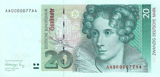 Върху банкнотата от 20 марки е изобразена Анете фон Дросте-Хюлсхоф (1797 – 1848), която по подобие на съвременница си Бети по-горе е поетеса - очевидно популярно занимание за жените с благороднически произход по времето на Просвещението. Впрочем, осемте портрета върху серията са поделени поравно между жени и мъже и е по-добре да замълча точно сега, за да не ме обвиниш в сексизъм или нещо подобно (или не дай си Боже, още по-лошо).