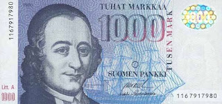 Върху банкнотата от 1000 маркие изобразен самият Дядо Коледа... добре де, послъгах малко в началото - няма марка с Дядо Коледа. Това е Андерс Кидениус (1729 - 1803), свещеник и държавник, един от най-значимите представители на северното Просвещение. Сред идеите които Кидениус отстоявал, в това число и като члена на парламента (по стечение на обстоятелствата - шведския, доколкото по негово време Финландия е част от Швеция), са свободната търговия, свободата на информацията и равните права. В книгата 100-те най-важни шведи в историята Андерс Кидениус е класиран на 17. място, а в предаването Великите финландци на финланската телевизия заема едва 40.