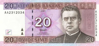 Йонас Басанавичюс (1851 – 1927) присъства върху банкнотата от 50 литас в ролята си на "баща на нацията", подписал Акта за независимостта на страната на 16. февруари 1918. Животът му обаче е не по-малко свързан с България. Между 1878 и 1882 г. Иван Басанович, както е известен тук, работи като главен лекар в болницата в Лом. След атентата срещу Александър II в Русия, нашият Александър Батенберг започва гонения на либерали в страната и Йонас/Иван я напуска, за да се завърне отново през 1884 г. Първоначално отново в Лом, Елена, като накрая се установява във Варна, където става член на Демократическата партия и изкарва един мандат в общинския съвет на града. В България д-р Басанович оцелява и при опит за атентат, след като някой си Александър Маноилов стреля по него и го уцелва в рамото. На гърба на банкнотата са изобразени Вилнюската катедрала с отделената си камбанария (напомня ми на Св. Николай в Плевен), паметникът на Гедиминас, крепостта Гедиминас и хълмът с Трите кръста.