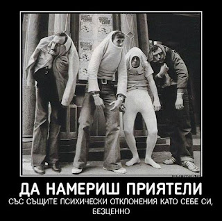 точно това обяснявах на една моя много мила позната с която се заприказвахме за мъже на шишман. беше разочарована, че мислела един мъж за нормален, а се оказало, че не е. аз й казах, че вече по принцип никой не е нормален, тя също, така че единствената реална възможност за относителен душевен мир е да намериш този, чиято лудост е съвместима с твоята.