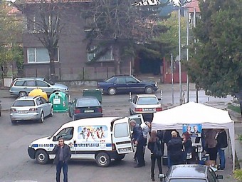 ГЕРБ използват автомобил на столичното 176 ОДЗ "Зорница" в район "Връбница", за да зареждат шатрата на кандидатпрезидентската им двойка в с. Мрамор, в която цял ден раздават курбан на гражданите